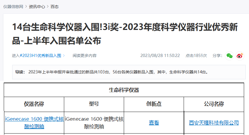 2023-09-07喜訊|iGenecase 1600便攜式核酸檢測箱入圍3i獎2023年優(yōu)秀新品了解更多