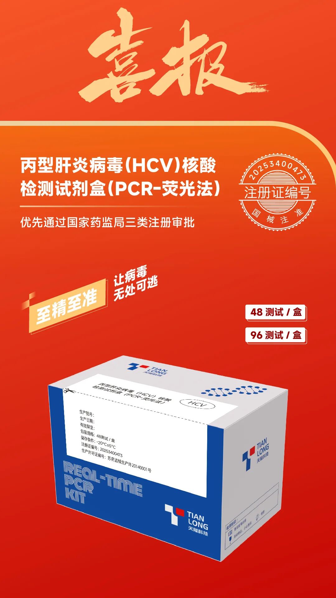 近日,天隆智造家族又添新成員,自主研發(fā)的超高敏丙型肝炎病毒(HCV)核酸檢測試劑盒(PCR-熒光法)通過國家藥監(jiān)局三類注冊!該試劑為天隆科技牽頭承擔(dān)的“十四五”國家重點研發(fā)計劃的戰(zhàn)略性轉(zhuǎn)化產(chǎn)品之一,此次為優(yōu)先通過NMPA審批,獲準(zhǔn)上市。
